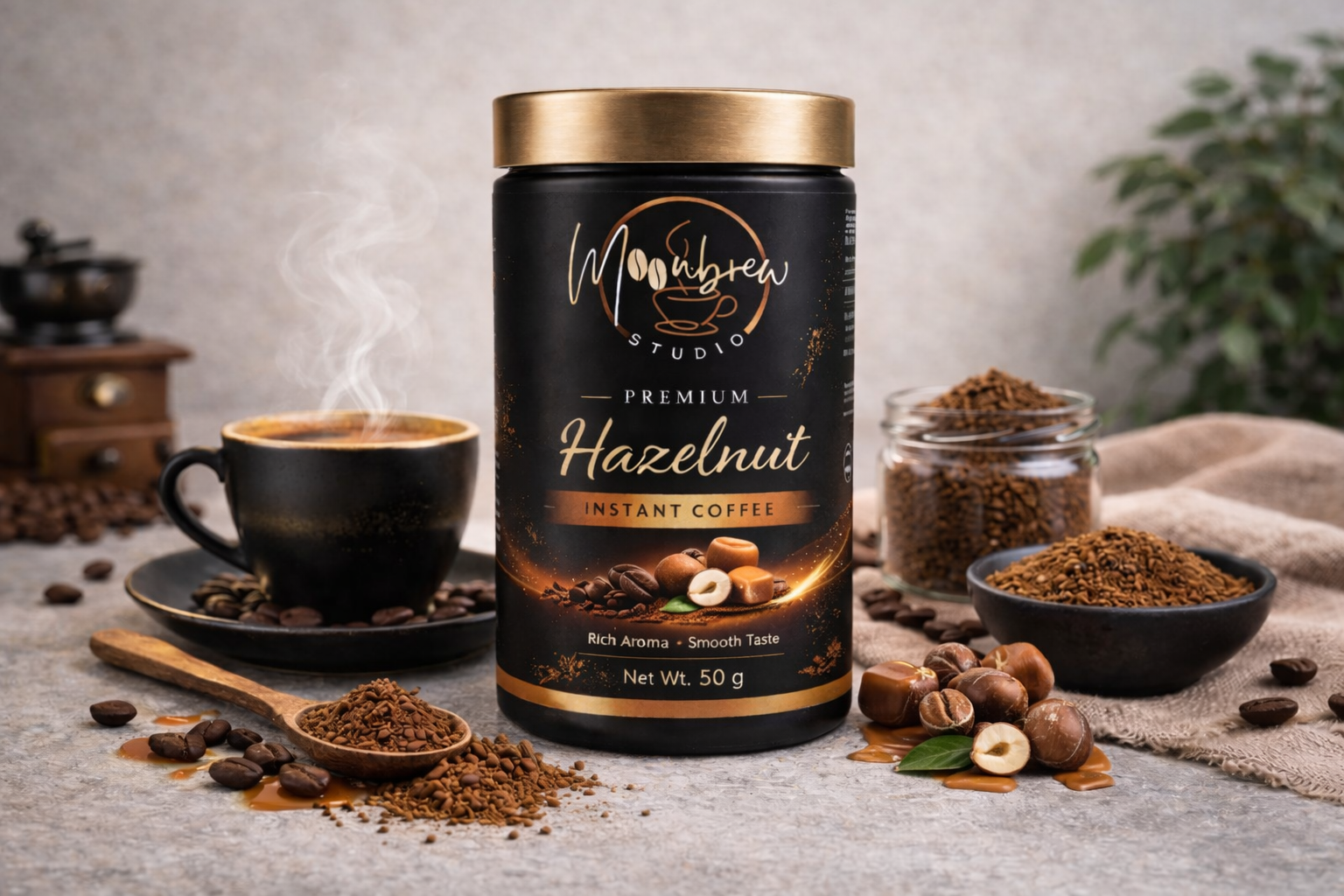 Aromatic instant coffee with roasted hazelnut flavor and a smooth nutty finish.
